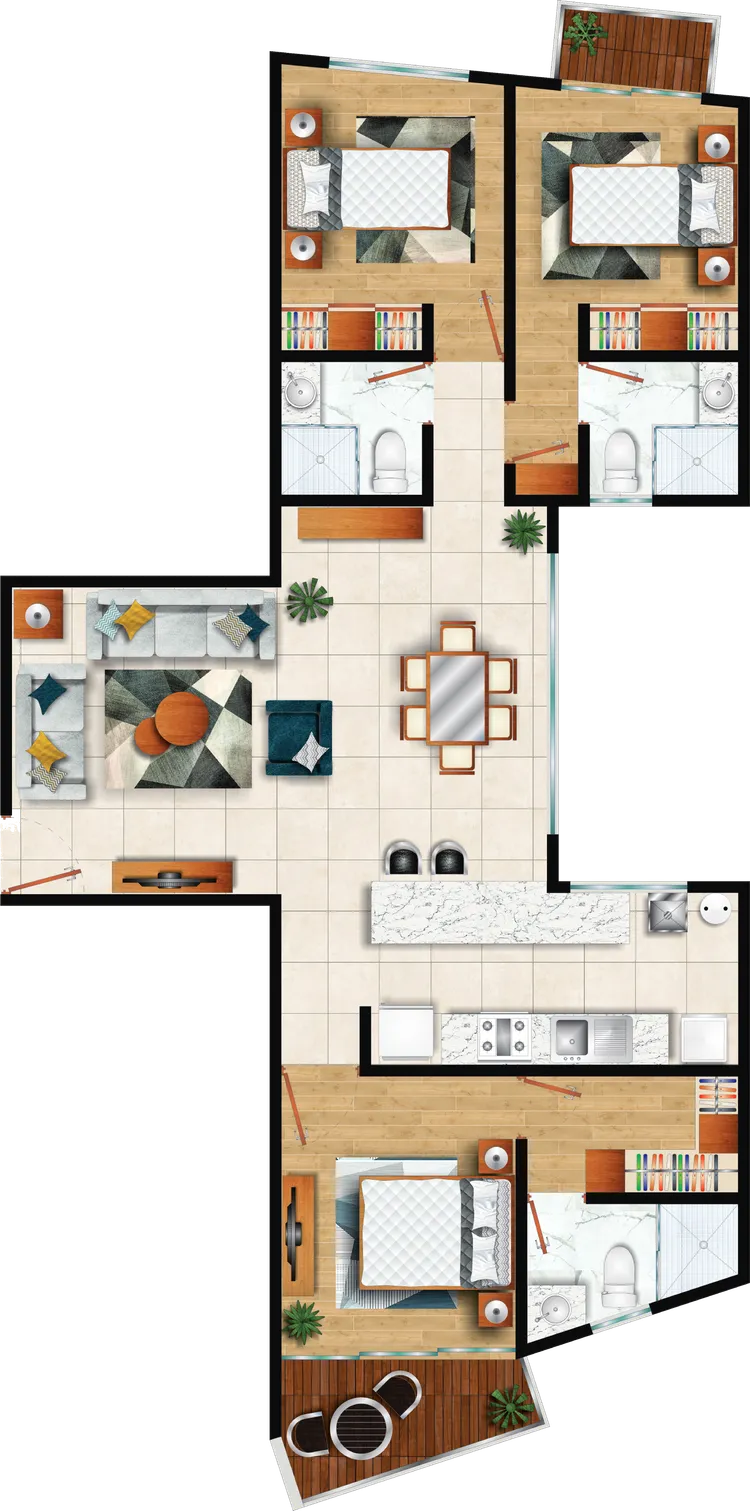 Confort Total: 3 elegantes dormitorios y 3 baños modernos.